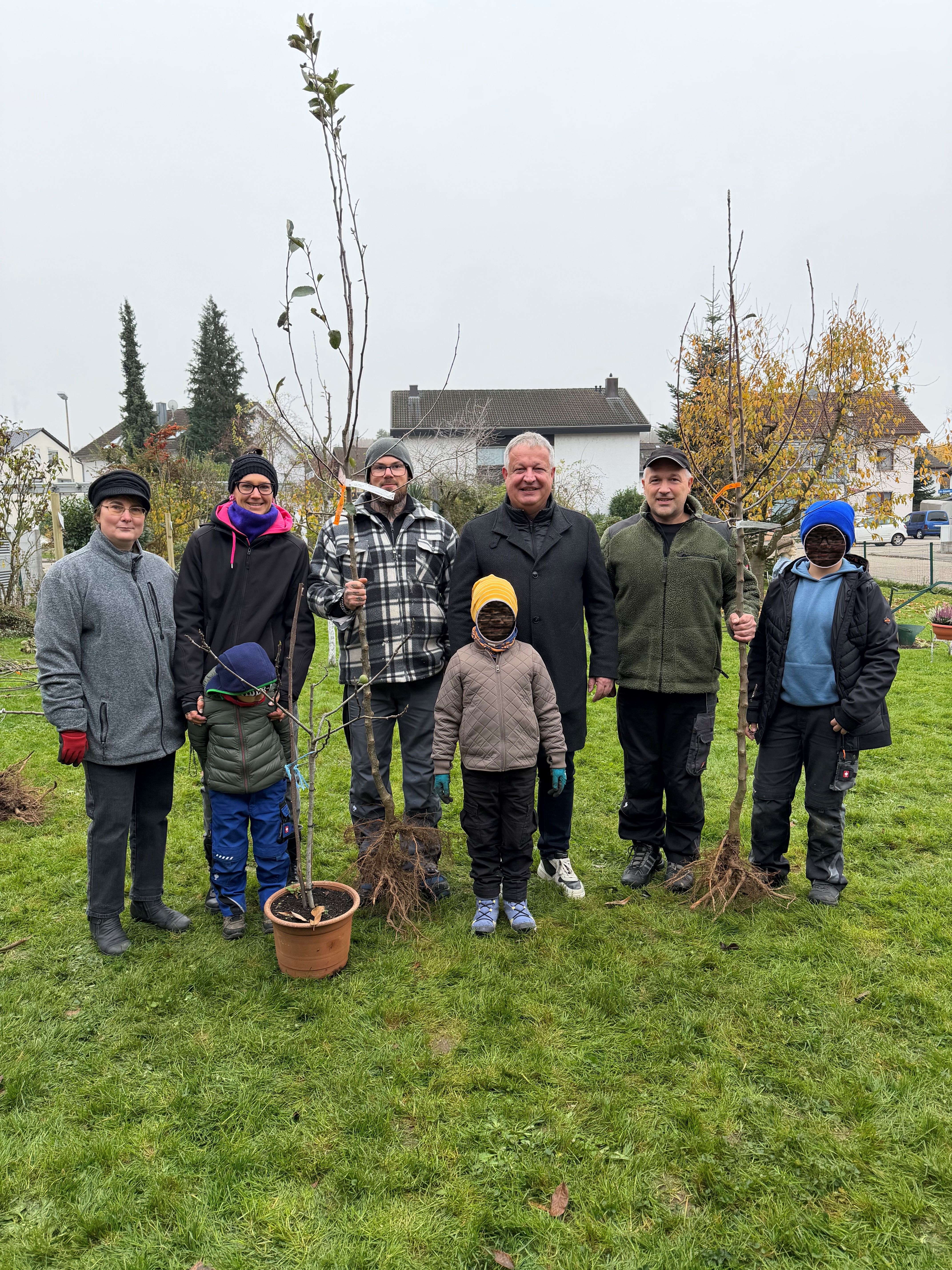 Ein fester Bestandteil zum Erhalt und Ausbau der Kuppenheimer Streuobstwiesen ist die jährliche Finanzierung einer Streuobstsammelbestellung durch die Stiftung „Streuobstinitiative Kuppenheim“. Seit der Gründung der Stiftung im Jahr 2012 wurden so knapp 2.000 Bäume finanziert und bereichern somit das Landschaftsbild von Kuppenheim und Oberndorf. Am vergangenen Samstag konnten insgesamt 37 Besteller ihre im Vorfeld bestellten Obstbäume auf dem Gelände des Obst- und Gartenbauvereins Kuppenheim in Empfang nehmen. Aus der umfangreichen Sortenliste mit insgesamt 177 Sorten, davon 77 Apfel- und 32 Birnensorten, konnten bis Anfang Oktober die gewünschten Bäume ausgesucht werden.„Brettacher“ und „Goldparmäne“ waren dabei die beliebtesten Apfelsorten in diesem Jahr, dicht gefolgt von den weiteren klassischen Sorten „Rheinischer Bohnapfel“, „Jonagold“ und „Topaz“. Große Resonanz zeigten auch die Pfirsich-Sorte „Benedicte“ sowie die Bühler Frühzwetschge und Nancymirabelle. Alle bestellten Bäume finden nun ihren Platz auf den Wiesen und Gärten der Gemarkung Kuppenheim und Oberndorf. Die Bäume werden in den nächsten Jahren heranwachsen und ihren Besitzern in Zukunft hoffentlich eine gute Ernte einbringen. Zu den stolzen Besitzern zählt auch die Familie Kahles aus Oberndorf. Sie haben an diesem Morgen ihren Apfelbaum der Sorte „Jonagold“ sowie einen Feigenbaum abgeholt. Insgesamt vier verschiedene Apfelbäume kann Marcus Westermann aus Bischweier nun sein Eigen nennen. Die Bäume finden ihren Platz auf seinem Grundstück in Oberndorf. Zusammen mit den Bäumen wurden Pfähle, Kokostrick als Bindematerial sowie Draht gegen Wühlmäuse sowie Wildverbiss kostenfrei an die Besteller herausgegeben. Bürgermeister Karsten Mußler bedankte sich bei der Ausgabe der Bäume beim Obst- und Gartenbauverein Oberndorf für die Organisation der diesjährigen Sammelbestellung. Schon die jüngsten Mitglieder zeigten an diesem Tag großen Einsatz und Engagement zum Wohle der Natur und dem immer wichtiger werdenden Artenschutz.