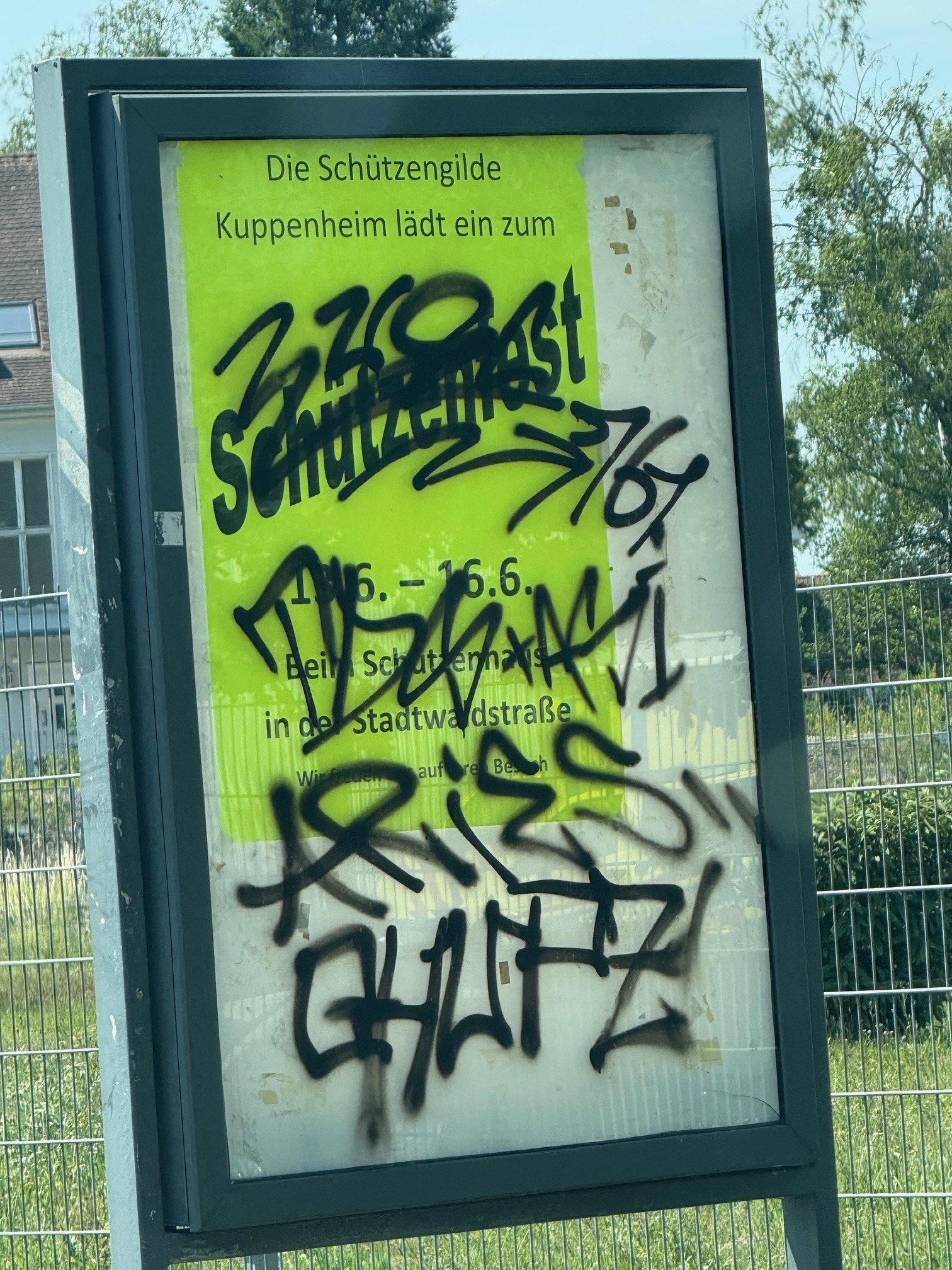 Am 12. Juni 2025 wurde festgestellt, dass eine der Glasvitrinen am Ortseingang (aus Richtung Bahnhof kommend) durch Graffiti beschädigt wurde (siehe Bild).