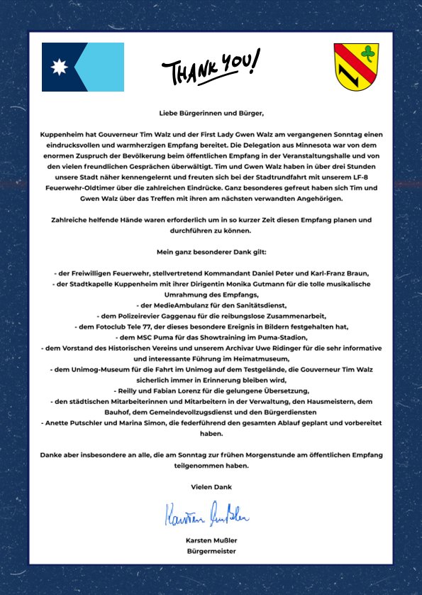 Kuppenheim hat Gouverneur Tim Walz und der First Lady Gwen Walz am vergangenen Sonntag einen eindrucksvollen und warmherzigen Empfang bereitet. Zahlreiche helfende Hände waren erforderlich um in so kurzer Zeit diesen Empfang planen und durchführen zu können.