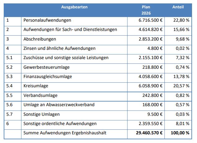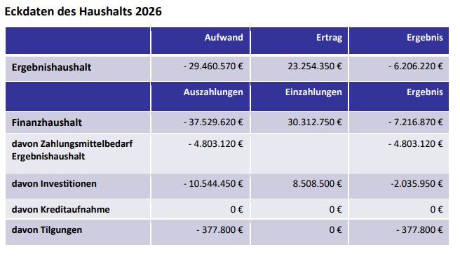 In den folgenden Tabellen sind die wesentlichen Finanzzahlen und Projekte des Haushaltsjahres 2026 aufgeführt.