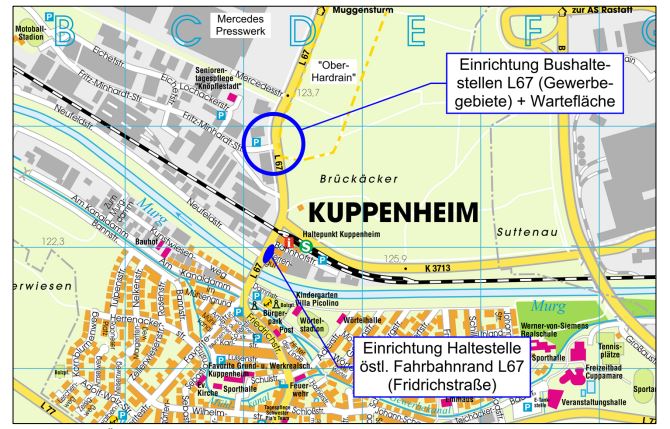 Um die nördlichen Gewerbegebiete besser an den öffentlichen Nahverkehr anzubinden, werden an der L67 zwei neue Bushaltestellen eingerichtet. Diese befinden sich am Kreisverkehr L67 / Fritz-Minhardt-Straße in der Nähe des Anschlusses der Firma „VEGA“. Die Haltestellen werden barrierefrei gestaltet und erhalten ein taktiles Blindenleitsystem. Zusätzlich wird ein Warte- und Pausenbereich für die Busfahrer eingerichtet. Mit den Bauarbeiten soll ab April 2026 begonnen werden, sodass die Haltestellen voraussichtlich zum Fahrplanwechsel im Dezember 2026 in Betrieb genommen werden können. Die Finanzierung wird zwischen der Stadt Kuppenheim, dem Regierungspräsidium Karlsruhe und der Mercedes Benz AG abgestimmt. Sollte das Regierungspräsidium die Kosten nicht rechtzeitig übernehmen, wird die Stadt vorläufig einspringen, wobei die Ausgaben später erstattet werden. Die für die Planung der Haltestellen sowie die Erweiterung der Straßenbeleuchtung notwendigen Mittel sind derzeit nicht im Haushalt vorgesehen, sodass hierfür außerplanmäßige Ausgaben im Rahmen der Erschließungsarbeiten „Ober-Hardrain“ anfallen. Im Falle einer vorläufigen Kostenübernahme durch die Stadt für das Regierungspräsidium würden diese ebenfalls als außerplanmäßige Ausgaben im Haushaltsjahr 2026 erfasst.