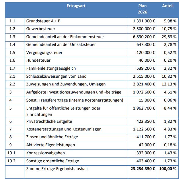 In der öffentlichen Sitzung am 02.03.2026 wurde der Haushalt 2026 nun formal verabschiedet. Der Ergebnishaushalt 2026 plant mit einem Defizit in Höhe von 6,2 Mio. €. Insbesondere die schlechte Konjunktur und damit einhergehende stark rückläufige Gewerbesteuererträge belasten das Planergebnis 2026. Konnte im Jahr 2025 noch mit Gewerbersteuererträgen in Höhe von 6 Mio. € geplant werden, so musste der Haushaltsansatz 2026 der Gewerbesteuer auf 2,5 Mio. € reduziert werden. Schon jetzt ist erwartbar, dass auch dieser Haushaltsansatz im Ergebnis deutlich unterschritten wird. Im Jahr 2026 werden derzeit Gewerbesteuererträge nur in Höhe von 600.000 € veranlagt. Dieser Ertragseinbruch stellt die Haushaltslage in Kuppenheim vor große Herausforderungen und führt zu einer sehr angespannten Haushaltslage.