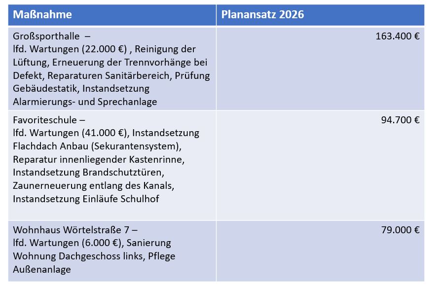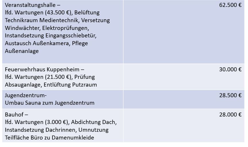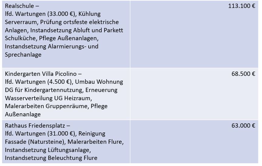 Neben dem laufenden Unterhalt der Gebäude und Außenanlage sind folgende wesentliche Unterhaltungsmaßnahmen geplant: