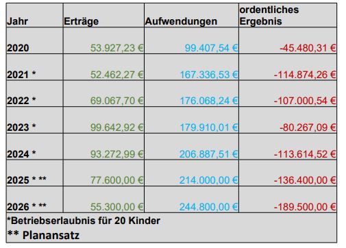 Parallel dazu sind die laufenden Betriebskosten, insbesondere durch Tarifsteigerungen im Personalbereich sowie gestiegene Sachkosten, kontinuierlich angestiegen. Während die Aufwendungen steigen, sinken die Erträge aufgrund der geringen Kinderzahl. Für das Jahr 2026 ist ein Defizit von rund 189.500 € eingeplant. Die rechnerischen Kosten pro betreutem Kind würden damit bei rund 37.900 € jährlich liegen und damit deutlich über den durchschnittlichen Kosten in den übrigen Kindertageseinrichtungen der Stadt. Zusätzlich wären Investitionen in Höhe von rund 155.000 € erforderlich, um behördliche Vorgaben zur Wasser- und Abwasserversorgung umzusetzen.