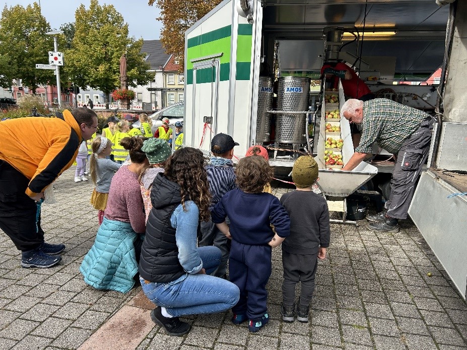 Bei der diesjährigen vierten Kuppenheimer Streuobstbörse nahmen rund 21 Teilnehmer teil. Neben vielen Familien mit Kindern, waren auch der Kindergärten „Kleine Riesen“ sowie der Waldkindergarten „Waldwichtel“ beteiligt. Außerdem nahmen auch schon die ganz Kleinen der Kindertagespflege „Zwergenstübchen“ an der Streuobstbörse teil. Nachdem im vergangenen Jahr die Apfelernte sehr gut ausfiel und viele der Streuobstinteressenten eine hohe Ernte einfahren konnten, sah die Situation in diesem Jahr leider anders aus. Füllte der Ertrag im letzten Jahr noch ganze Anhänger bis oben hin, so war die Ausbeute in diesem Jahr für viele weniger zufriedenstellend. Viele der städtischen Apfelbäume trugen nichts bis fast nichts. Auch lagen viele Äpfel bereits sehr früh am Boden. Demnach konnten auch deutlich weniger Bäume den Streuobstinteressenten zugeteilt werden. Wie in den vergangenen Jahren bekommt bei der Streuobstbörse jeder Teilnehmer im Vorfeld durch die Geschäftsstelle der Stiftung „Streuobstinitiative Kuppenheim“ ein konkretes Grundstück, sowohl städtische als auch privat zur Verfügung gestellte Grundstücke, mit genauen Baum Nummern zugeteilt. Das Abernten der Äpfel können sich die Teilnehmer somit frei einteilen. Ebenso steht ihnen frei, was mit den gesammelten Äpfeln passiert. Eine Möglichkeit für die Streuobstbörsen-Teilnehmer sowie weitere Apfelsammler ist das Natursaft-Mobil. Hier kann man die eigenen Äpfel direkt vor Ort zu Apfelsaft zu verarbeiten lassen ohne weite Wege zurückzulegen. So stand vergangene Woche Mittwoch das Natursaft-Mobil am Friedensplatz bereit. Auch die Kindergärten waren Vor-Ort und der Obst- und Gartenbauverein Kuppenheim, der das Natursaft-Mobil an diesem Tag tatkräftig unterstützte, erklärte den Kindern genau, welchen Prozess die Äpfel durchlaufen, bis am Ende der leckere Saft herauskommt.